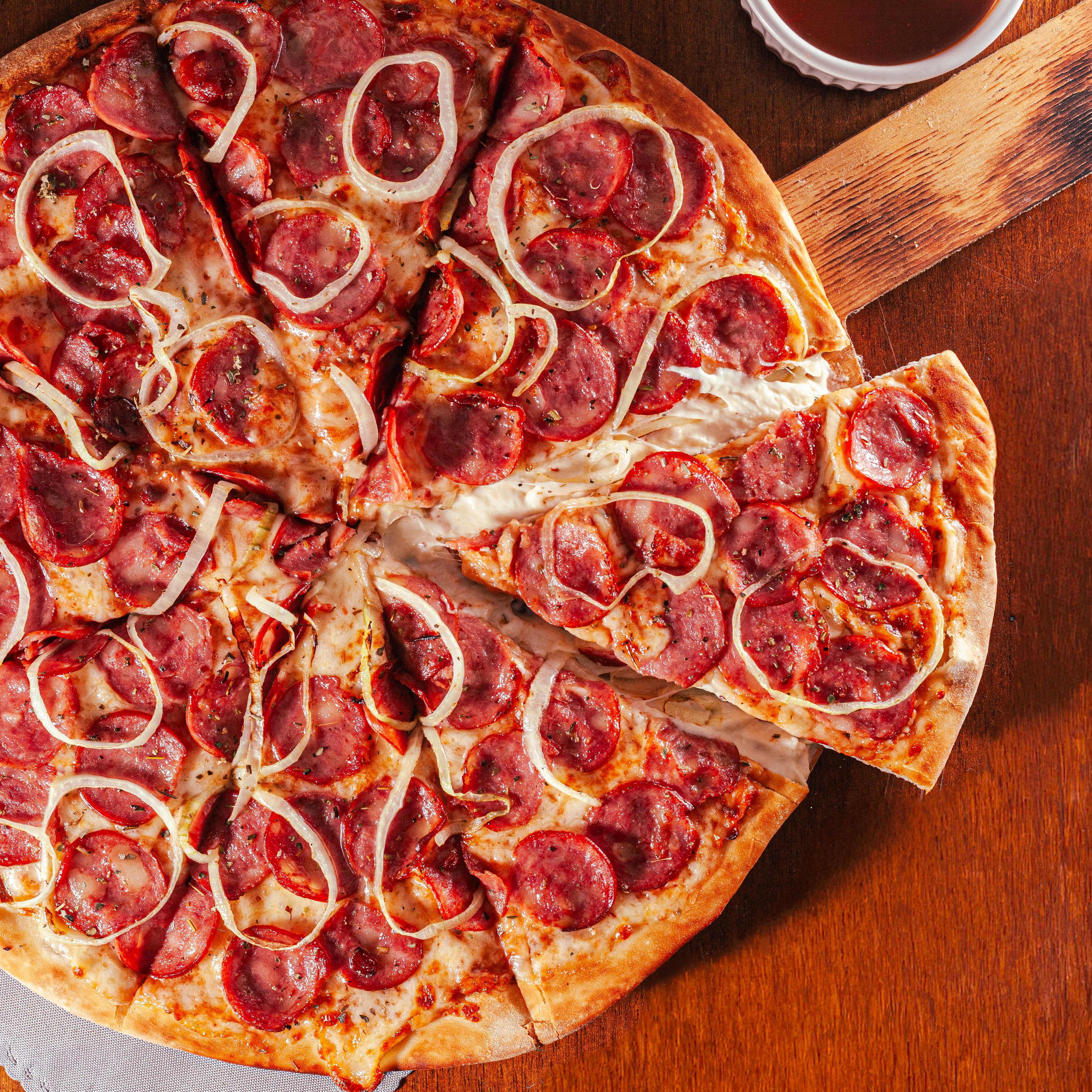A top 1 da galera! Molho de tomate, mussarela, fatias de calabresa suculentas, cebola e orégano. Essa é a maioral e conquista todo mundo! Ela é gigante, serve até 4 pessoas e tem o tamanho perfeito pra compartilhar com a sua família!